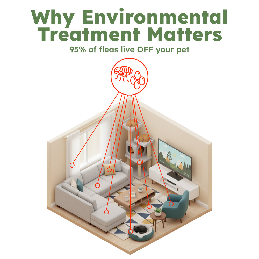 You need to treat both! Fleas spend 95% of their lifecycle OFF your cat - in carpets, bedding, cat trees, and furniture. Always spray the environment where your cat spends time. Treating only your cat misses most of the problem.