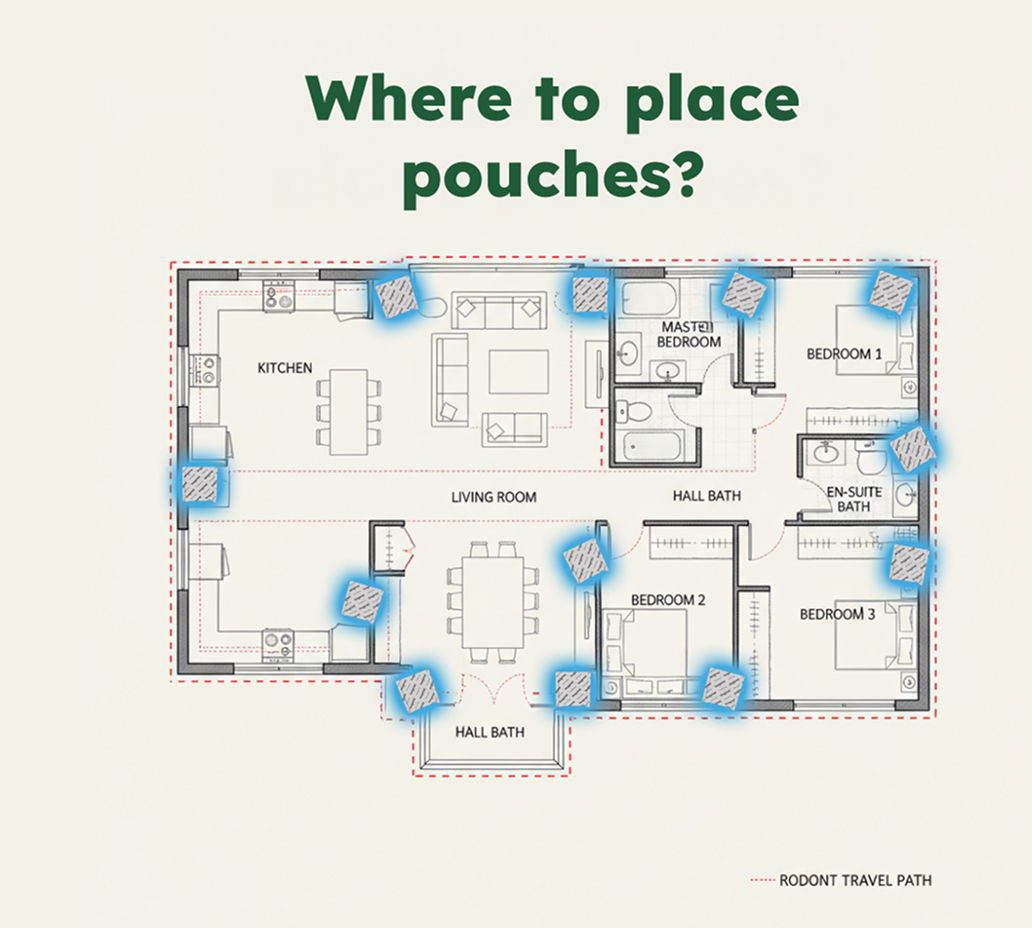 Place pouches near areas where rodents typically travel - along walls, in corners, behind appliances, and near areas where you've seen droppings or activity. Avoid placing them in the middle of open spaces since rodents prefer to travel along edges. Good locations include pantry corners, perimeter of the basement, living room corners, garage entrances, and behind stoves or refrigerators.